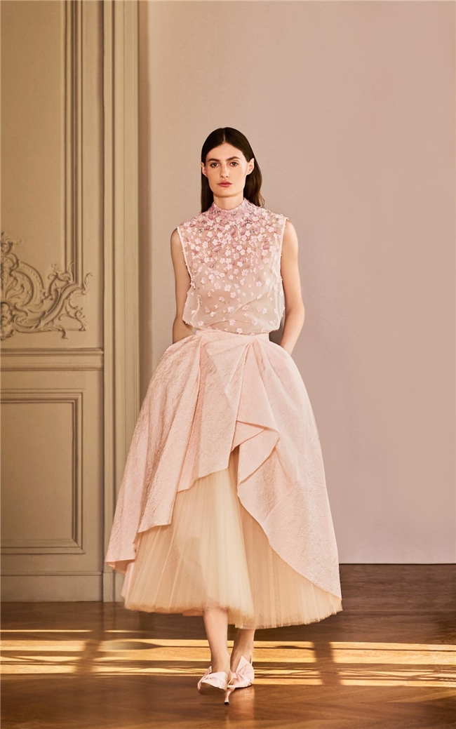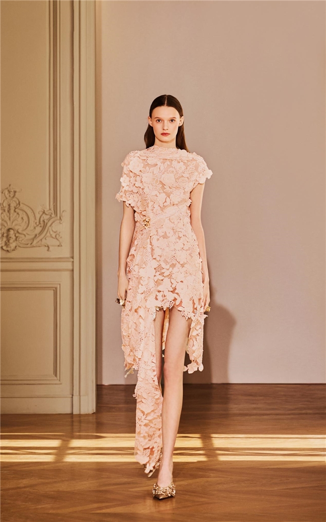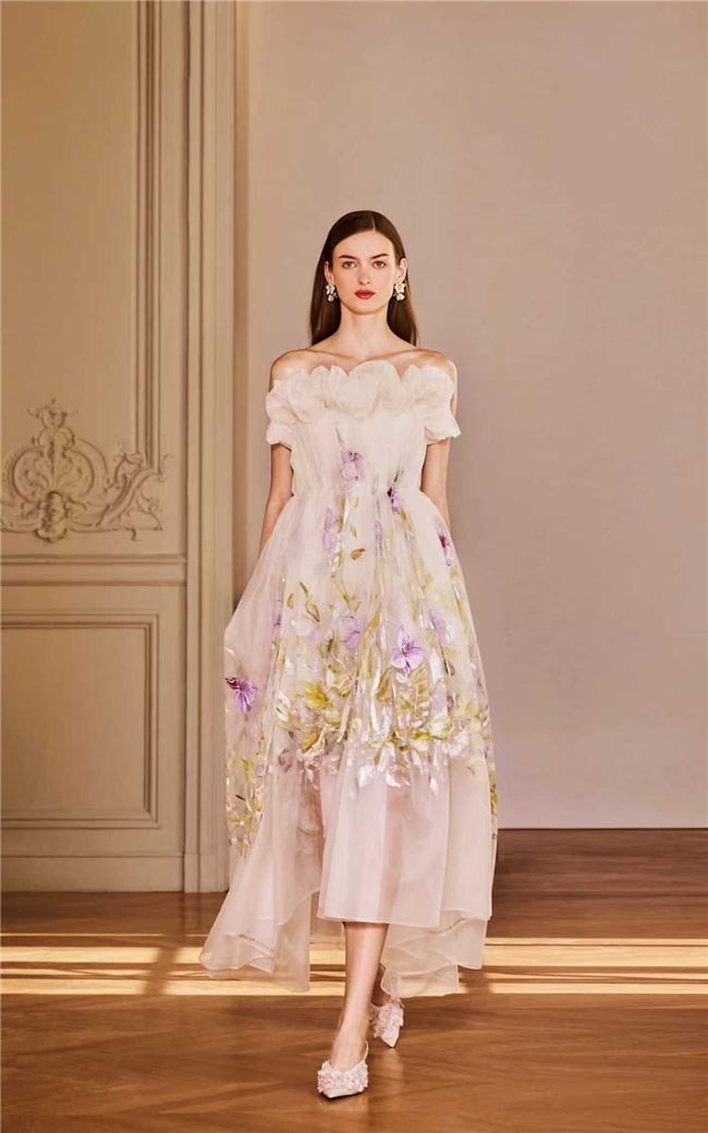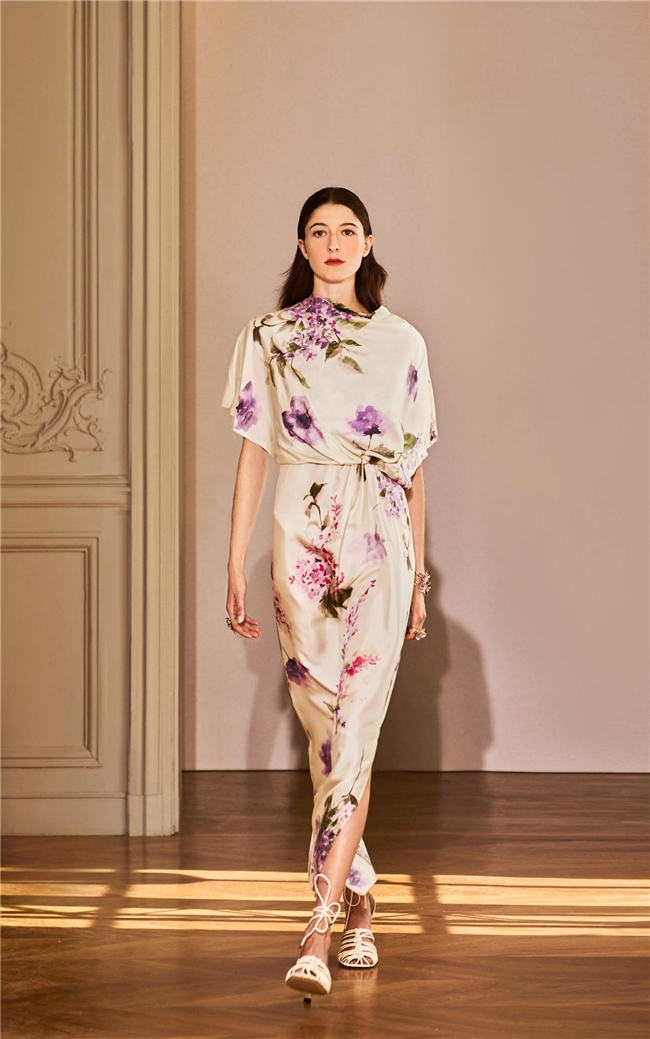 延续抽象艺术的自由精神,将群像小花与大型花卉以刺绣语言重新诠释。细腻渐变的满铺小花、富于情感层次的大花图案,借助精致手工艺与年轻色彩,具象化地表达出浪漫且精致的女性韵味。廓形上巧妙融入及A型裙与直身连衣裙的对比,搭配花纱面料、泡泡纱与都市感外套,于实穿之中传递出高级场合感与不失柔美的现代气息。