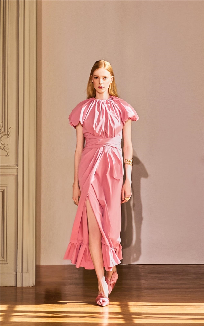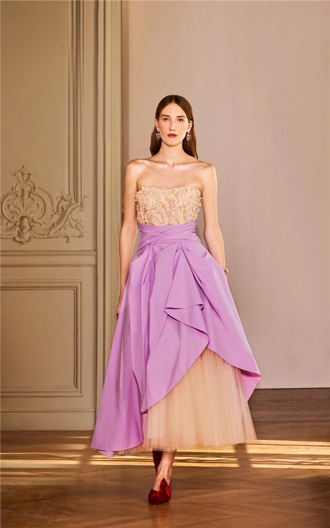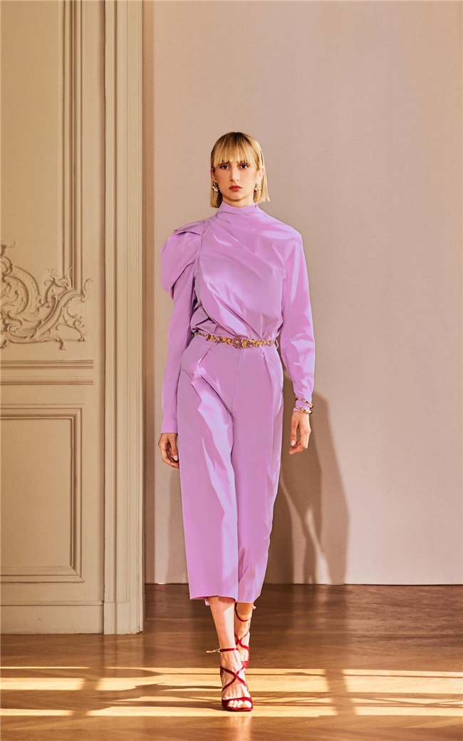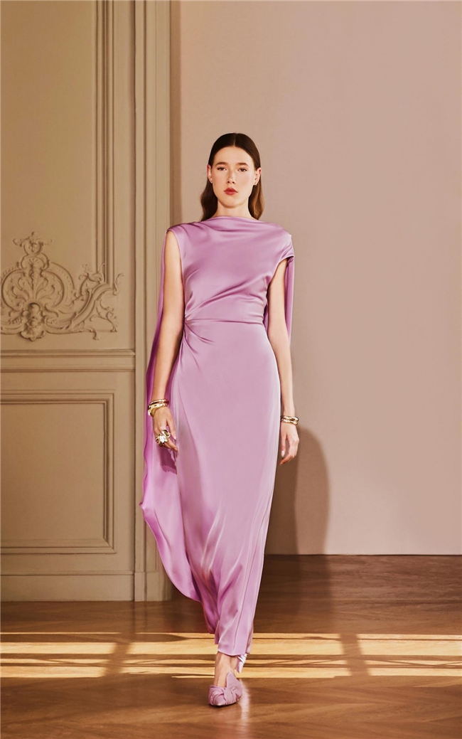 从抽象表现主义的狂放笔触中汲取灵感,将看似随性实却精妙的线条通过立体剪裁呈现于简洁的直身或裹身廓形之上。品牌标志色La-purple与裸色系连衣裙及套装相映成趣,搭配质感缎面与塔夫绸,以举重若轻的手法诠释出兼具轻盈与力量的艺术气质,致敬雕塑感般的女性生命力。