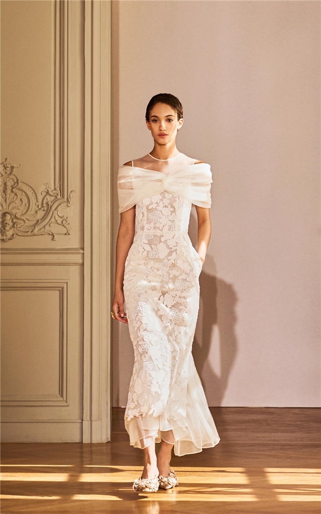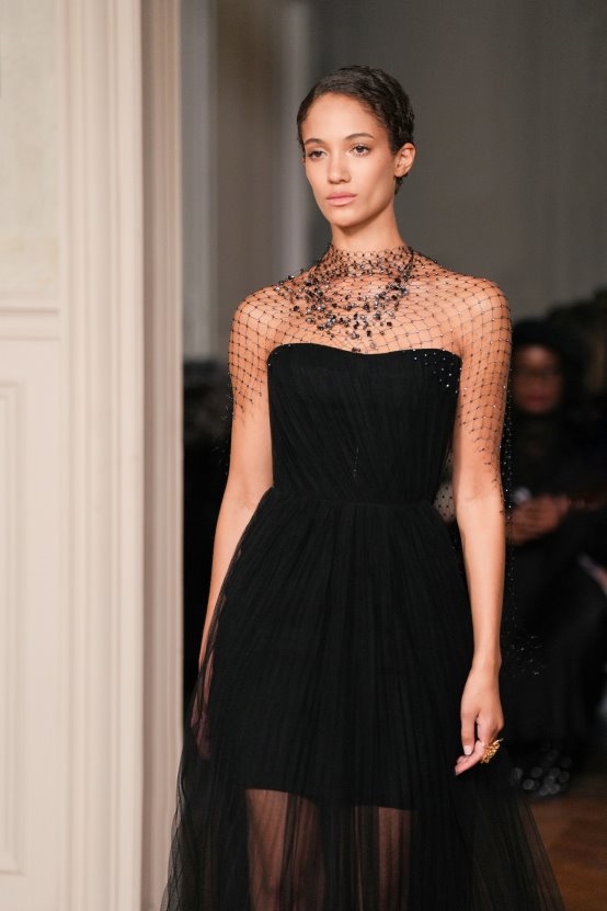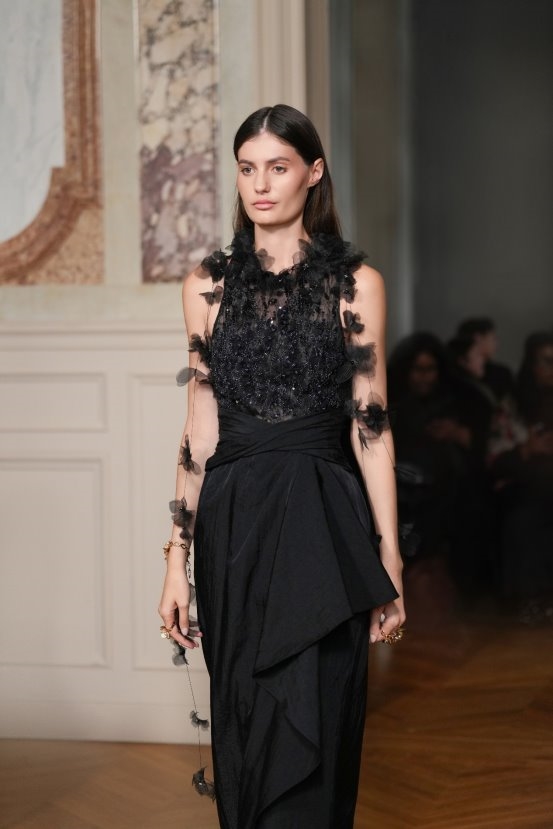 匠心精神下的「雕塑之轻」、「花绘之意」、「光影之诗」三部曲,章节式呈现高定艺术的演进历程。来自意大利的Albino Damato作为这次的巴黎大秀创意顾问,融汇巴黎风格的浪漫与意大利的精湛工艺,从当代艺术与建筑结构中汲取灵感,将理性与感性凝练为贯穿华服与身体之间的隽永内力。