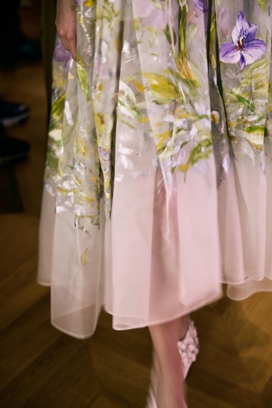 极致的工艺与细节,将花卉的泰然沉静、细腻气质以“自然物性”的方式呈现,自然花卉本身的呼吸,自有节律,轻盈地平衡着其经典建筑轮廓,带来随环境变化轻重缓急的流动感。细微处细视,从灵感手稿到成品,历经繁复臻选顶级面料、以及凝萃精巧手工技艺,剥离工艺冗余带来的厚重,纯粹捕捉自然之物——水的肌理律动、光影的流转与色彩的呼吸,让面料成为自然诗意的载体。