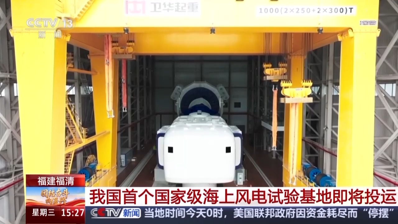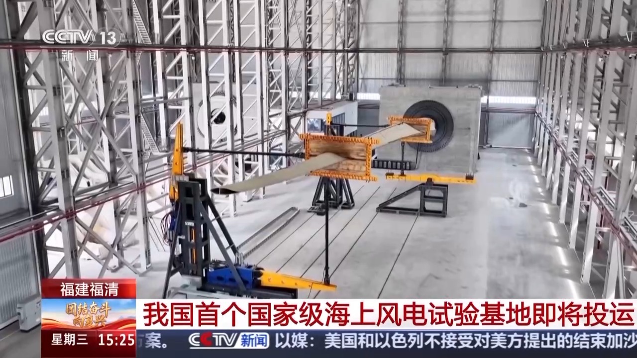 总台记者 黄珊:海上风电试验基地包括陆上检测中心和试验风电场两部分,陆上检测中心坐落于福清市的江阴产业园内,靠近江阴港码头,旁边是福建最大的风电产业园。整个陆上检测中心包含了叶片试验平台和传动链测试平台。