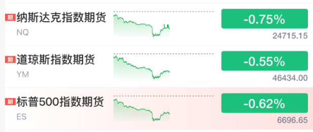 截至发稿,标普500指数期货下跌0.6%,纳斯达克100指数期货下跌0.75%。追踪波动率的Cboe VIX期货一度走高至18上方。