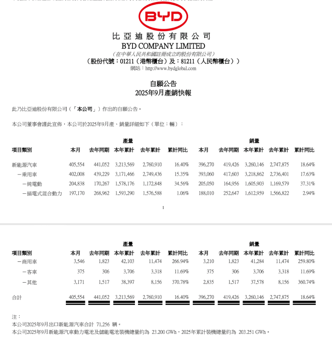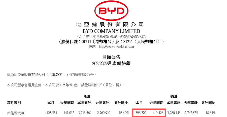 10月1日,比亚迪发布的产销数据显示,9月新能源汽车销量为39.63万辆,同比下降5.52%。