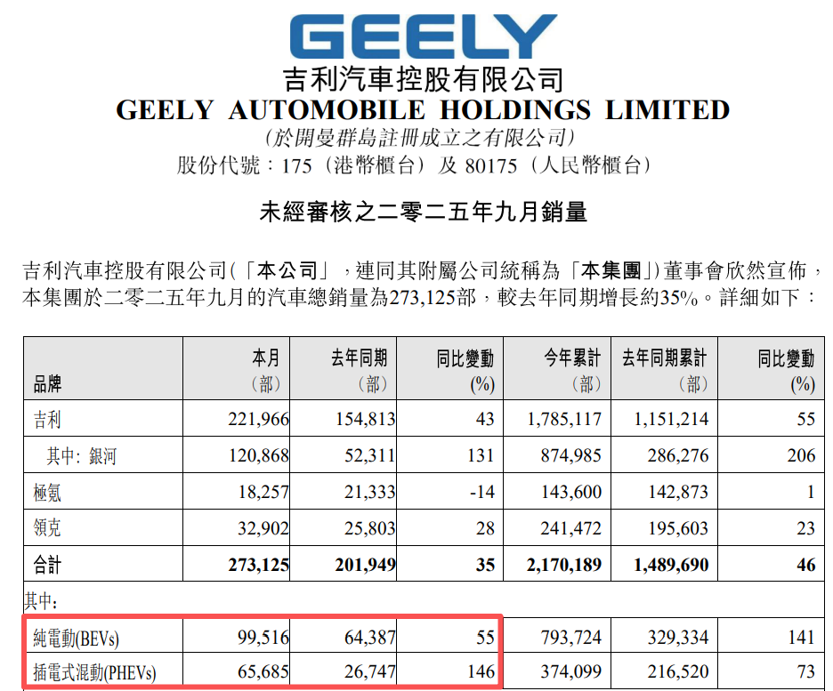 吉利9月销量达27.31万辆,同比增长35%,其中新能源销量达16.52万辆,同比增长81.27%,环比增长12.12%。