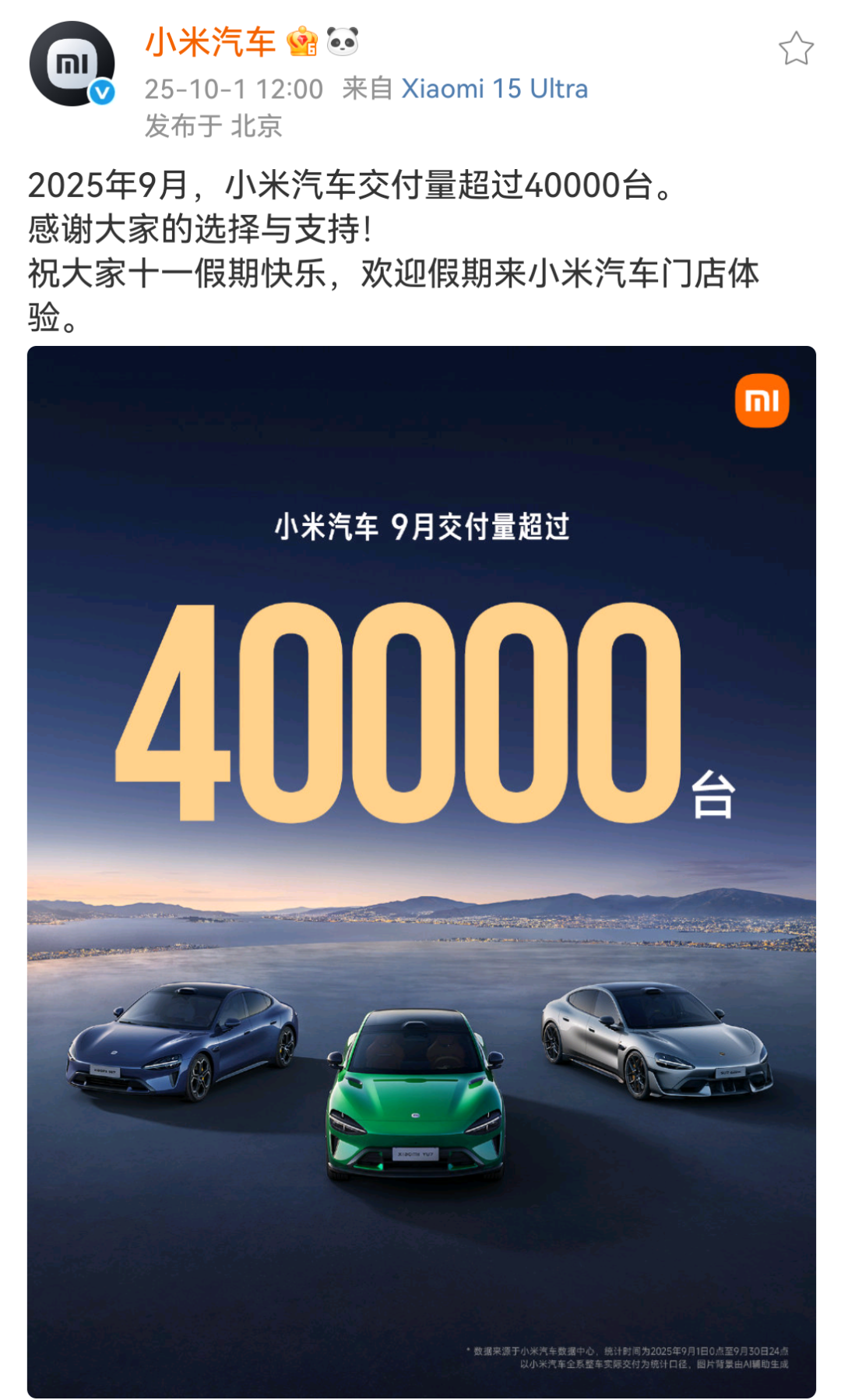 小米9月交付量首次超4万辆,主要来自SU7、YU7两款车型。虽然小米仅披露了总体交付量信息,但是YU7从9月第三周开始已经成为销量主力。