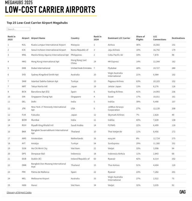 东京成田机场(NRT) 从第19升至第7,LCC航班占比 46%,显示出低成本航空在亚洲的重要地位。