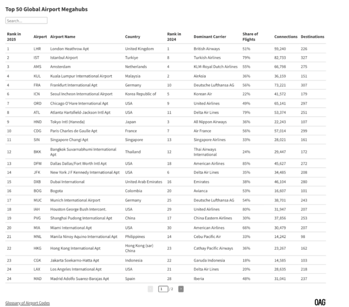 伊斯坦布尔机场(IST) 是今年的最大黑马,从第8名一跃升至全球第2。凭借航线网络的快速扩张,它的潜在航班衔接量增长25%,其中 土耳其航空(Turkish Airlines)占比高达 79%。