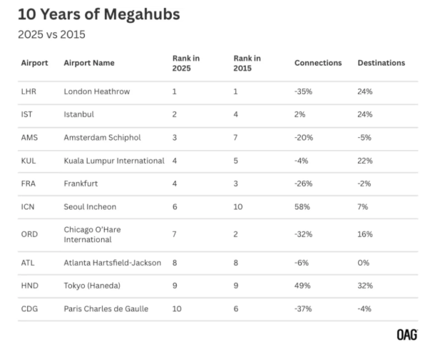这些变化显示,全球航空网络正在经历结构性调整:传统欧洲枢纽稳健,但土耳其、亚洲等新兴枢纽正在快速崛起。