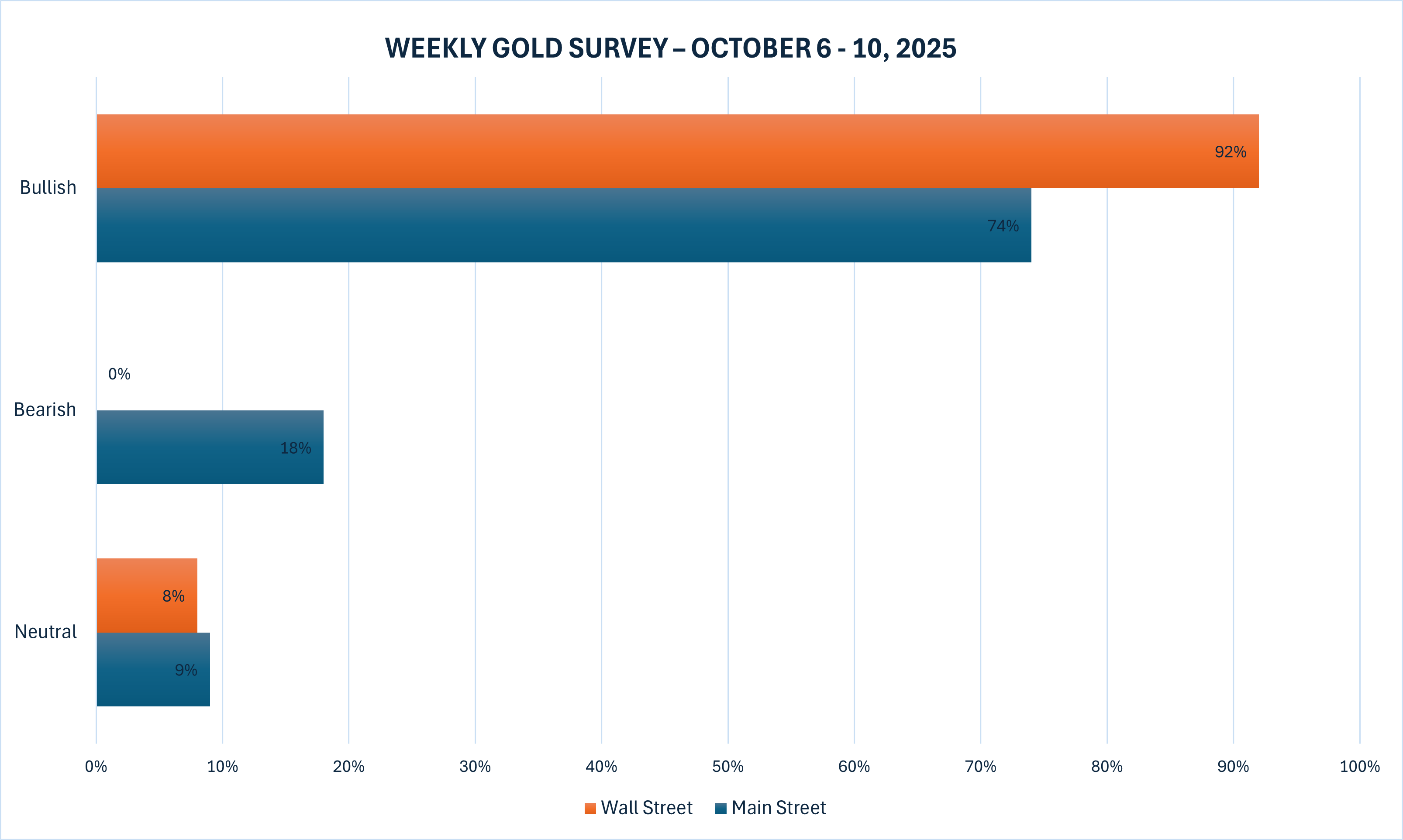 根据 Kitco News 最新每周黄金调查,华尔街仍保持高度看多态度,而大街(Main Street)投资者对此的信心也在逐步追赶。班诺克本全球外汇(Bannockburn Global Forex)董事总经理 Marc Chandler(马克·钱德勒) 表示:“本周期货金属已连续第七周上涨,自七月底以来,仅有一周下跌。本次美国政府停摆、欧洲重新调整俄罗斯储备的讨论,以及欧洲的混合战局,都有利于市场情绪。”他并指出,“近期支撑大致构建在 3,800 美元附近,4,000 美元也并非遥不可及。”