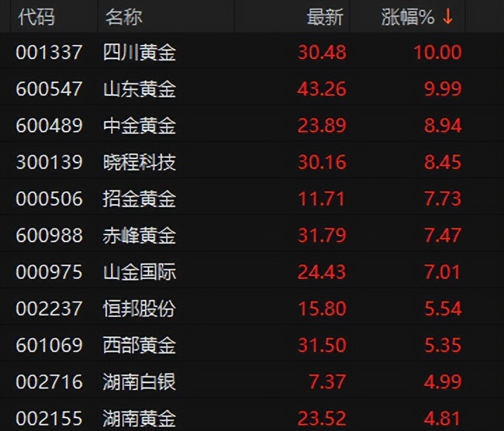 A股黄金股开盘大涨。截至午盘,申万贵金属指数上涨7.89%,涨幅居所有行业首位。四川黄金一字涨停,山东黄金涨停,中金黄金、晓程科技涨超8%。