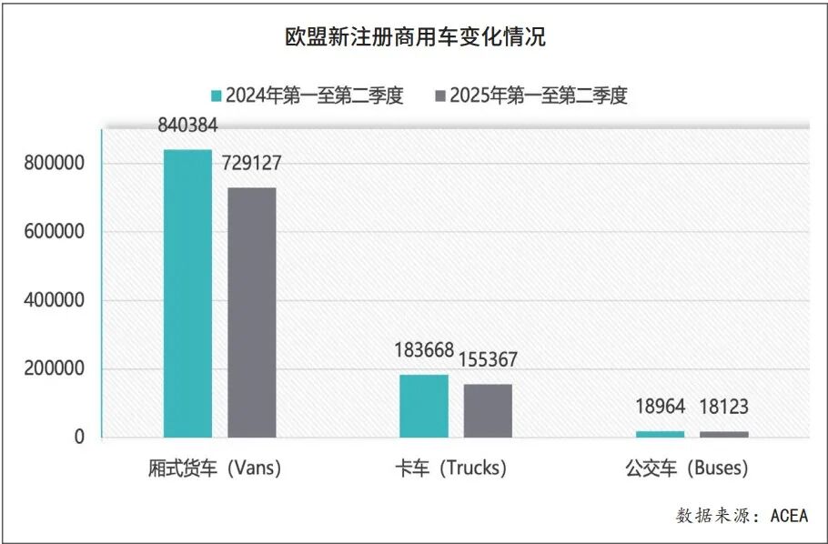 有业内分析指出,这种疲软主要体现在欧洲商用车市场的整体萎缩和当地消费者购买欲望的降低。欧洲汽车制造商协会(ACEA)与国际清洁交通委员会(ICCT)数据显示,2025上半年,欧盟新注册商用车数量出现明显下滑,其中厢式货车(Vans)新注册量同比下滑13.2%,卡车(Trucks)新注册量同比下滑15.4%,此外,在公交车(Buses)领域,新车注册量也出现了4.4%的同比下滑。