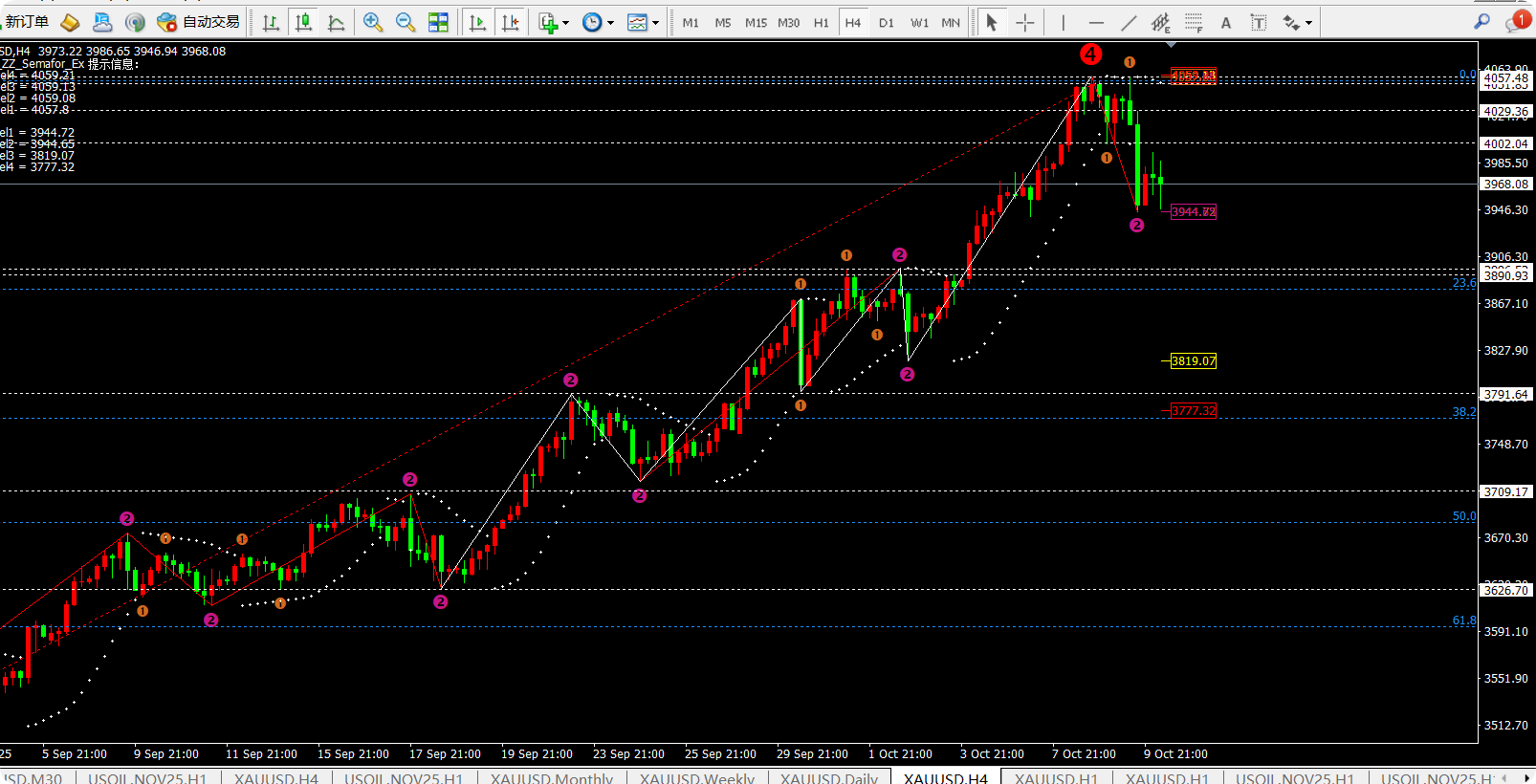 日线下方关注昨日低点3945一线,跌破必向3925-3894附近运行。而上方关注4000和4030以及4058一线的阻力。因为目前4小时呈现弱势,所以我们第一个空单在4000下方。