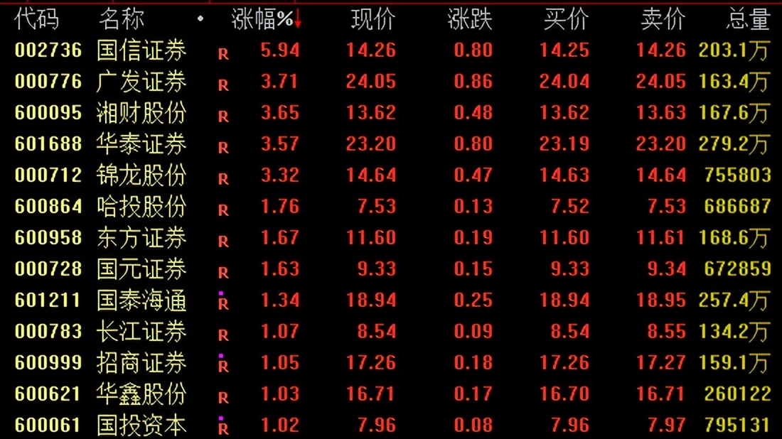 券商板块盘中强势拉升,国信证券一度触及涨停,锦龙股份一度涨超9%。截至收盘,国信证券涨约6%,广发证券、湘财股份、华泰证券、锦龙股份等涨超3%。