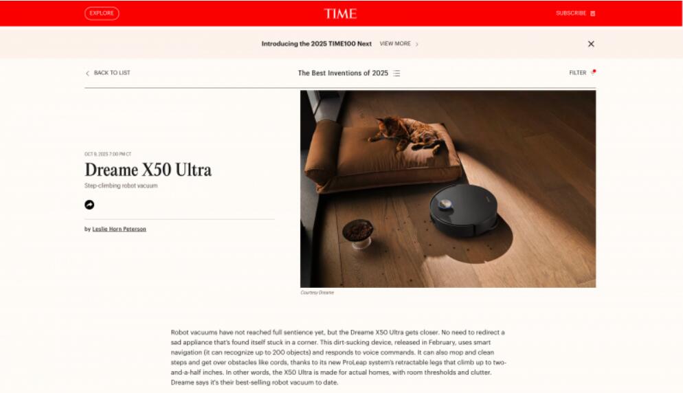 10月9日,美国《时代周刊》(Time)公布2025年“Best Inventions of the Year”(年度最佳发明榜单),揭晓了备受关注的年度最佳产品。追觅扫地机X50 Ultra凭借突破性的仿生机械足技术和卓越的创新实力入选,成为此次唯一上榜的扫地机产品。