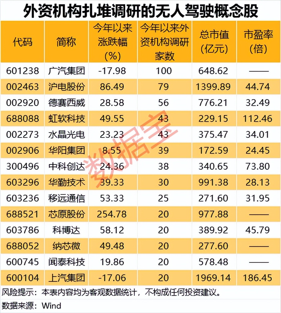统计显示,49只无人驾驶概念股今年以来获得外资机构调研,其中14股外资机构调研家数在20家及以上,广汽集团、沪电股份、德赛西威居前,分别为100家、79家、56家。
