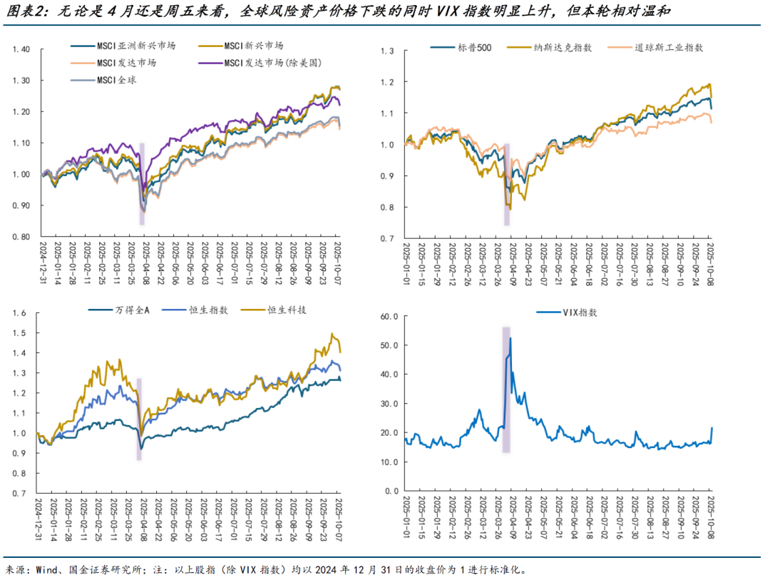 从两个维度来看:①相比此前4月“对等关税”出台后资产价格的下跌幅度,本轮资产价格的下跌幅度相对较窄;②尽管衡量市场恐慌情绪的VIX指数上升,但无论是绝对值的角度还是变化幅度来看,当前VIX指数尚未上升至比较极端的水平。我们理解,4月“对等关税”首次出现在投资者的视野当中时,在超预期的同时市场对其感受到的更多是“陌生”和“不知所措”,反而导致所有资产价格选择“先跌为敬”;而本轮来看,已积累一定经验的市场更倾向于认为4月的经验可以复制,同时市场可能也对后续即将召开的APEC峰会仍抱有一定的期待。