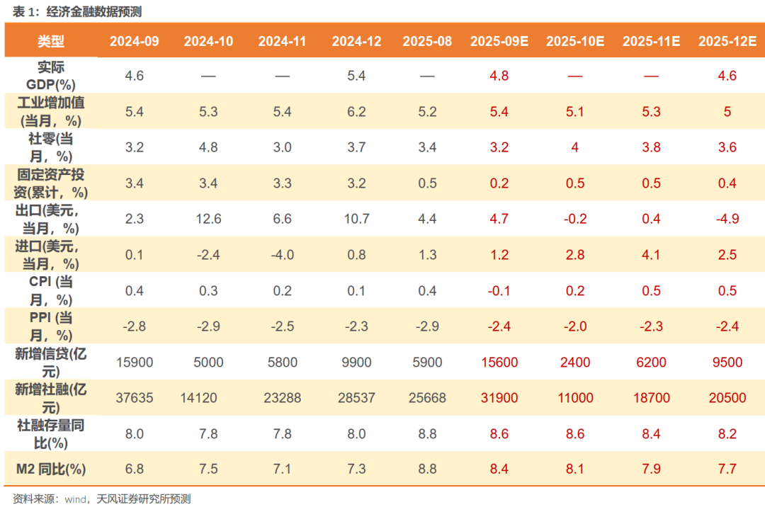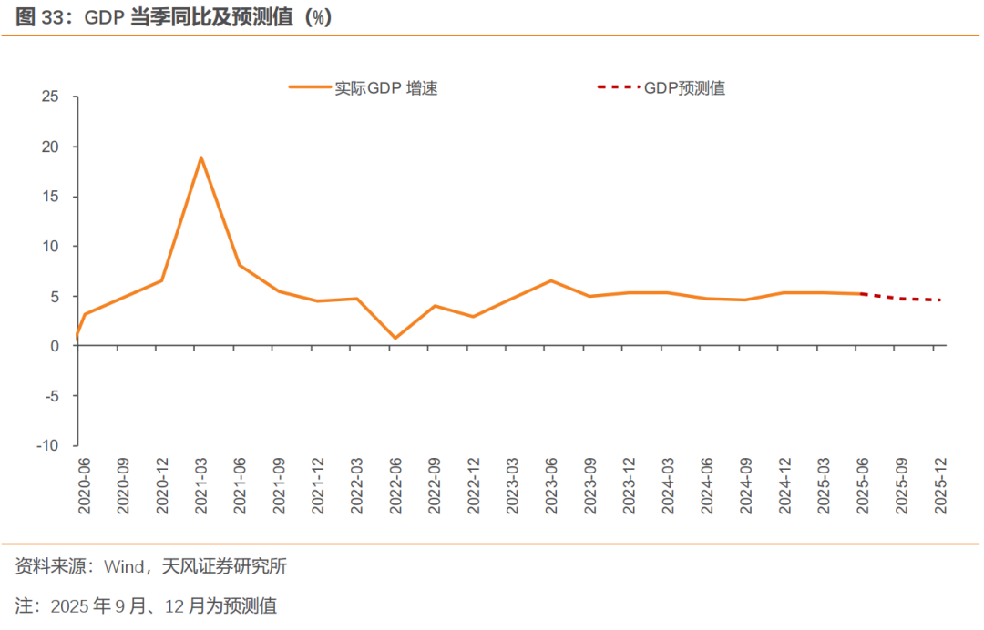 2025年处于“十四五”规划收官与2035年远景目标的关键节点,下半年宏观经济有望延续修复态势,运行总体平稳,GDP读数可能小幅下滑,全年有望实现5%左右的经济增长目标。四季度经济增长仍需观察政策效果能否持续释放,一是消费贷财政贴息政策对信贷规模的撬动效果和对社零增速的提振作用;二是5000亿元新型政策性金融工具,对于社会资本、银行配套贷款的撬动作用,以及对基建投资的拉动效果;三是财政部表示“提前下达部分2026年新增地方政府债务限额”,8000亿元特殊新增专项债是否提前至今年发。