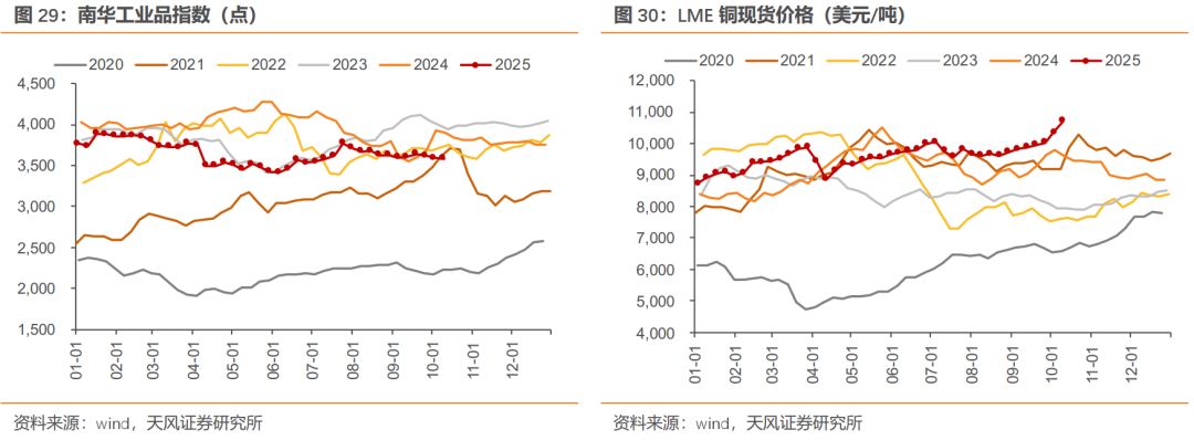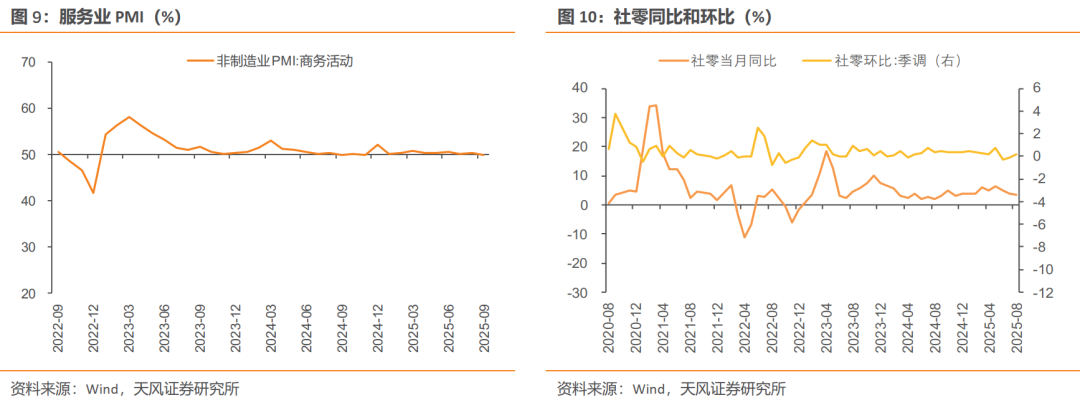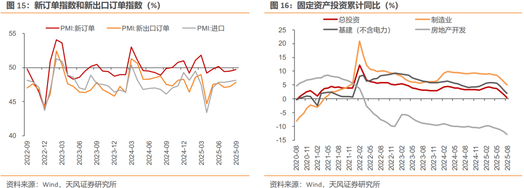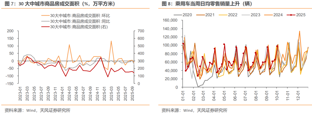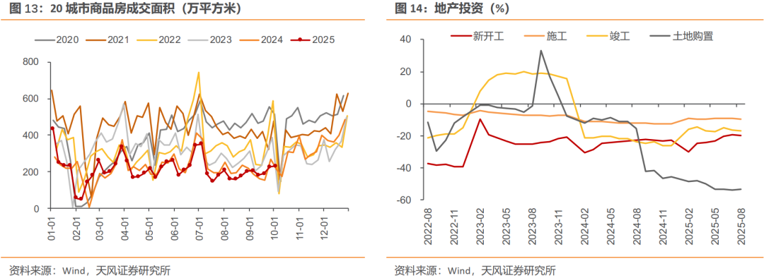 从高频数据来看,9月以来新房销售环比回升,同比表现仍然偏弱,低于季节性水平,尤其是三线等低能级城市表现较弱;土地成交面积环比改善,不及去年同期水平。高频价格指标方面,9月螺纹钢和玻璃价格有所反弹,主因在于供给端的“反内卷”政策推动商品价格上涨,但需求端仍然偏弱,地产投资或延续低位运行。