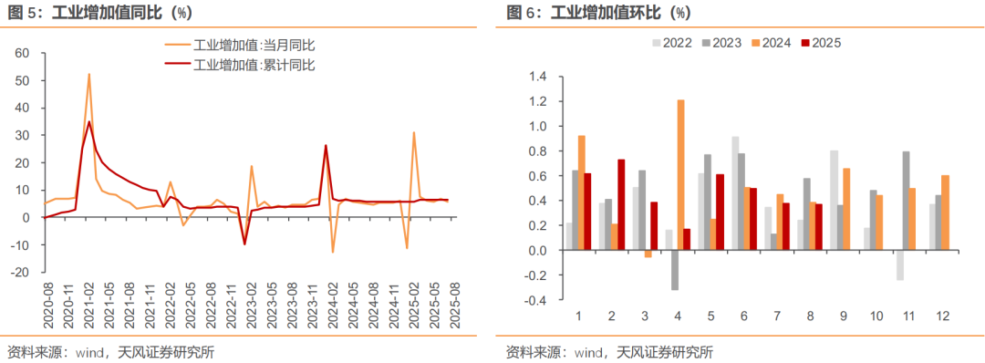 往后展望,高技术制造和消费相关制造仍有望维持韧性,但考虑到四季度政策效果可能边际减弱,叠加地产拖累和关税政策不确定下的出口后劲不足,预计四季度工业增加值增速可能较三季度有所放缓,预计四季度工业增加值同比为5.1%。