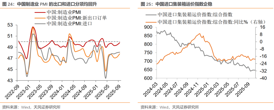 往后展望,一是,中美关系在国庆假期后出现转紧趋势,四季度面临关税升级风险;二是,美国政府关门、欧日政坛动荡,或打击经济前景,外需或转弱;三是,去年四季度由于“抢出口”表现强劲导致基数较高。预计四季度出口同比在-1.7%左右,四季度进口同比在3.1%左右。