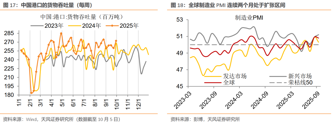 9月出口增速小幅上行。一是中美关税风波尚未升级,二是外需仍有韧性,全球制造业PMI指数上行连续处于景气区间,三是9月港口货物吞吐量好于去年同期。