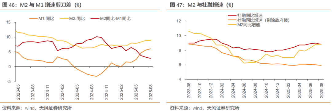 回顾8月,新增社融2.57万亿,同比少增4655亿,其中信贷是主要拖累,政府债净融资支撑有所减弱。新增信贷5900亿元,同比少增3100亿元,居民短贷和中长贷均为同比少增,企业短贷同比多增,企业中长贷同比少增。M1同比回升至6.0%,主要受企业活期存款增长加速和经济活跃度提升驱动;M2同比保持8.8%的水平,财政支出加快与去年同期低基数的支撑作用显著。