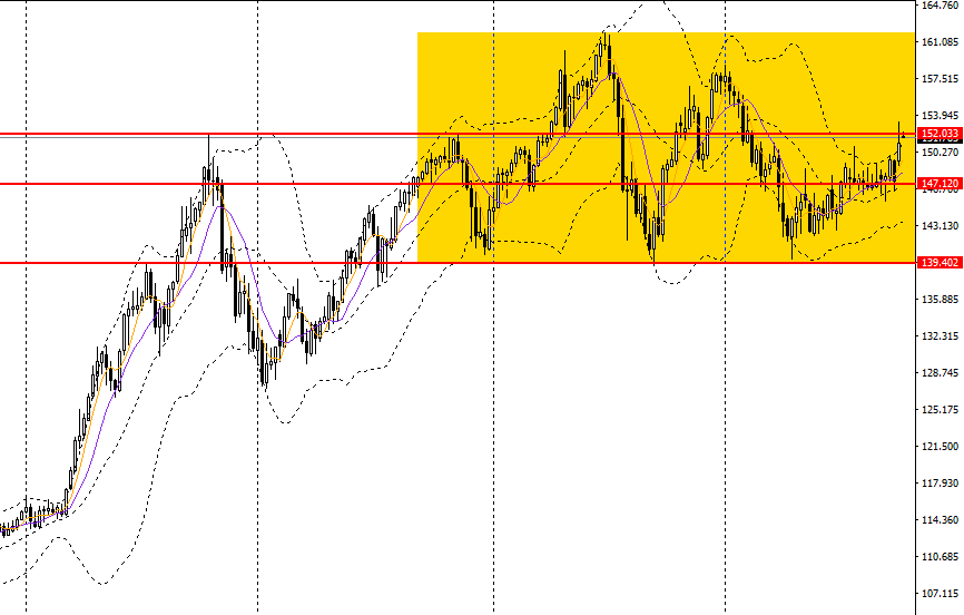 美日上周收流星阳线,RSI位于50之上,波段有望延续上行。周五大幅跳水,刺破5日均线,日线RSI回落,4小时呈多重顶,152附近承压可继续做空。