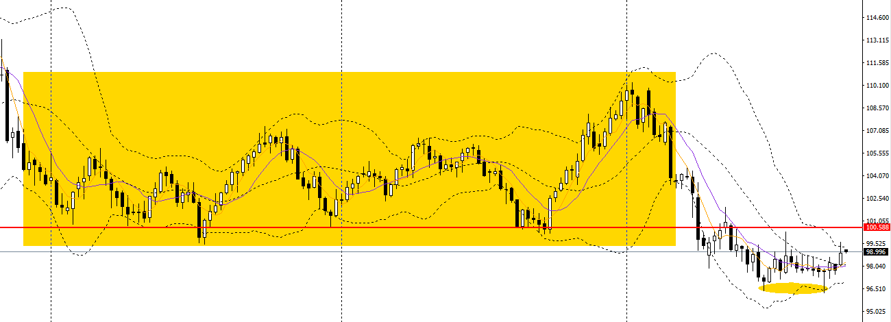 美元指数上周冲高回落,立于5周均线之上,RSI位于50左右,波段整体趋势仍偏弱。周五收长阴线,日线RSI拐头向下,4小时失守99关口,如继续承压于下方,后市可看空至98.70。