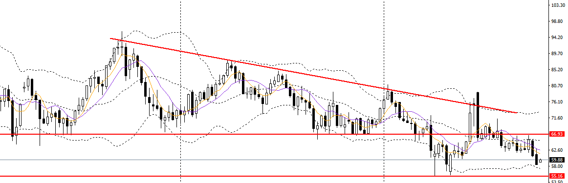 美原油上周深度跳水,承压于5周均线,RSI位于50下方,波段预计将维持震荡偏弱格局。周五重幅受挫,失守60关口,且下破日线布林下轨,空单可继续持有,短线预计将下探58。