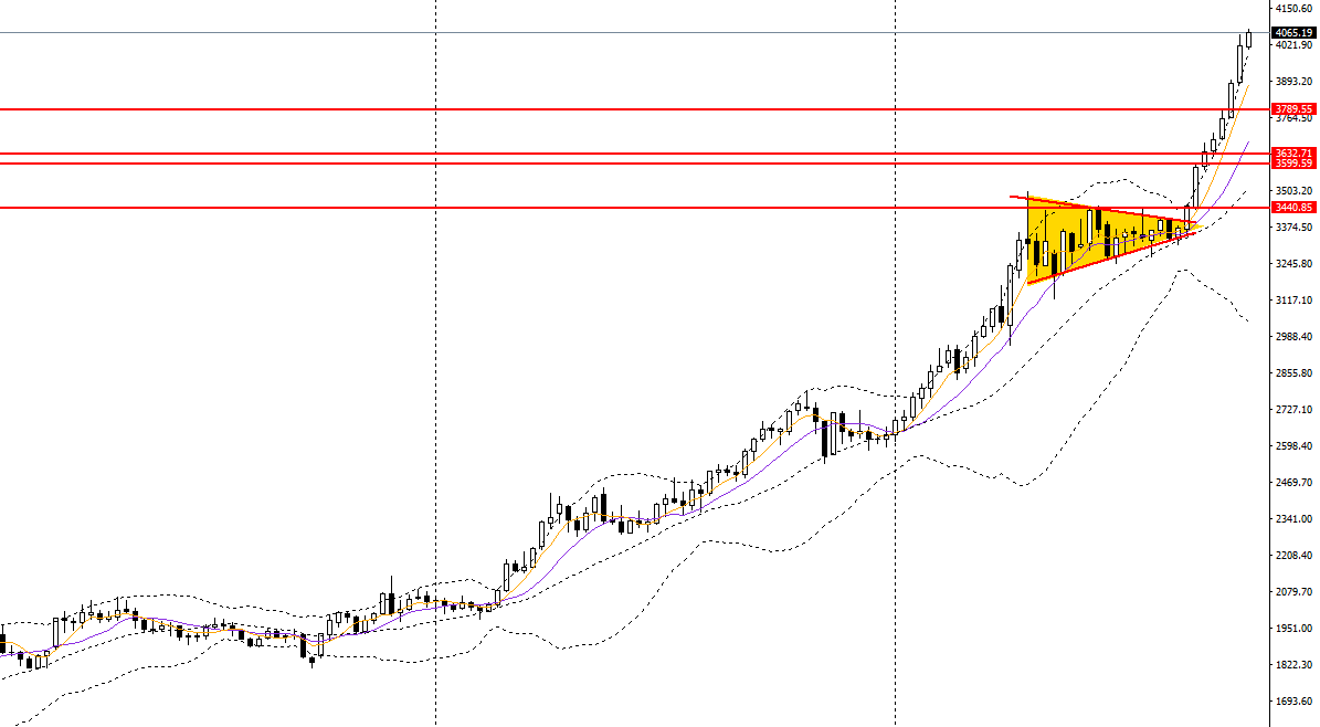 黄金上周继续破高,立于周线布林上轨上方,RSI到达超买区,波段有望冲击4100。周五止跌反弹,再度站上5日均线,日线RSI位于超买区附近,4小时刺破前高,4040上方可延续低多思路。黄金/人民币如于927附近企稳可进多。