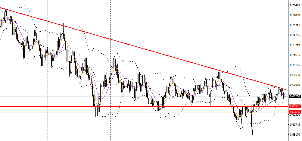 澳美上周深度下挫,下破10周均线,仍承压于下行趋势线,波段整体趋势仍偏空。周五收长阴柱,下探日线布林下轨,受5日均线压制,日线RSI跌破50,4小时下破0.65一线支撑,短线走势疲软,如于0.6540附近承压可进空。
