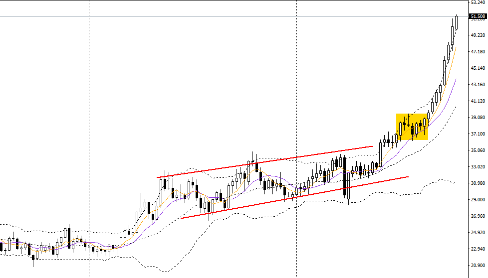 白银上周继续收阳,5周、10周均线乖离率进一步上升,波段预计将继续创新高。周五收流星阳线,触及日线布林上轨,仍立于5日均线上方,多单仍可持有,后市有望挑战52。
