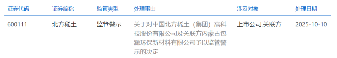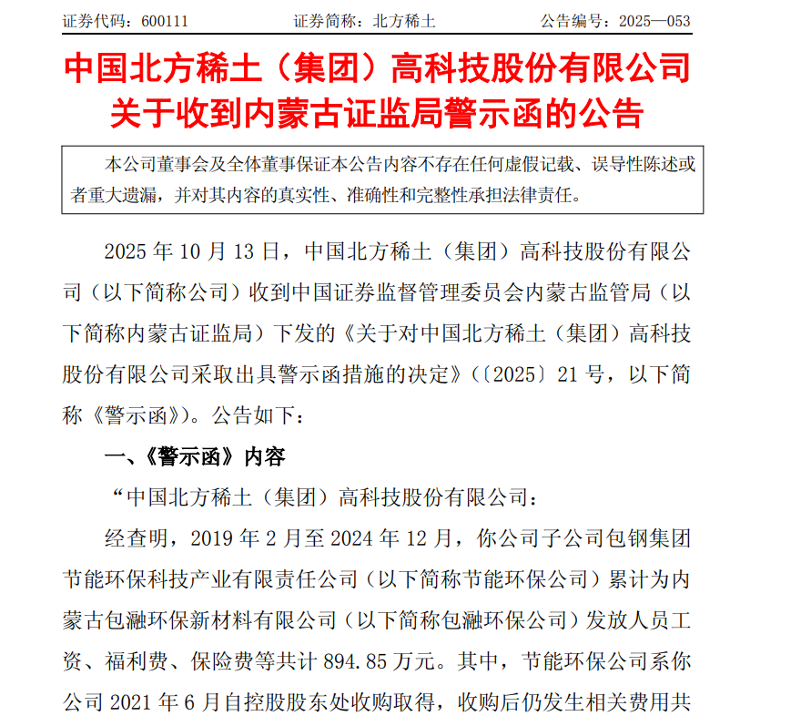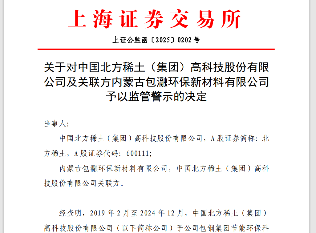 此前10月10日,上交所已就该事项对北方稀土及关联方包瀜环保公司予以监管警示,并要求北方稀土及其董监高人员采取有效措施对相关违规事项进行整改,并结合决定书指出的违规事项,就公司信息披露及规范运作中存在的合规隐患进行深入排查,制定针对性的防范措施,切实提高公司信息披露和规范运作水平。