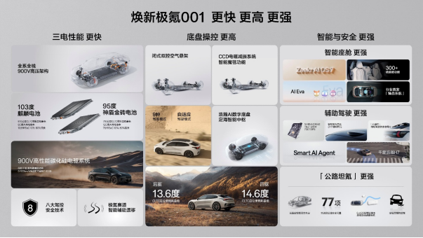 在安全性能上,焕新001延续了“公路坦氪”的美誉,从被动安全、主动安全到电池安全进行全面强化。新车集成88项主动及智能安全配置,全系新增远端气囊,A柱等关键部位加入CBS高强度复合材料嵌件,显著提升碰撞防护能力。