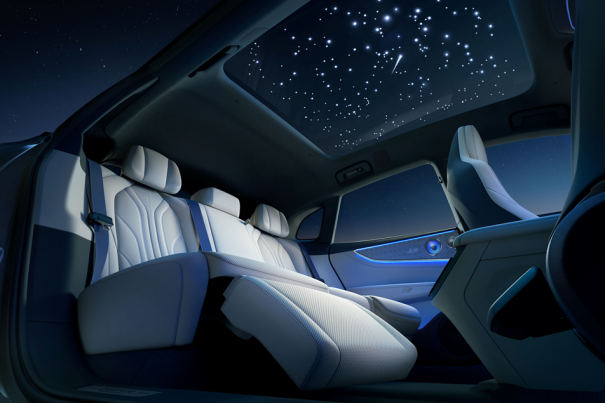 全球首发的“浩瀚星空顶”,在LV分区调光天幕中嵌入了500颗独立星粒,厚度仅增加1毫米,不影响空间与视野。用户可一键点亮专属星座,配合迎宾、节日彩蛋等场景模式,将每次出行变为与星空的浪漫对话,同时具备87%的能量隔绝与近100%的紫外线阻隔能力。