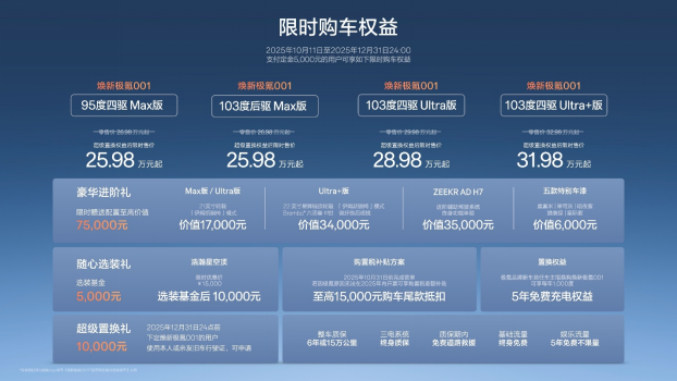 10月11日,豪华猎装轿跑焕新极氪001正式上市,官方零售价26.98万元起,超级置换权益后,限时售价为25.98万元起。