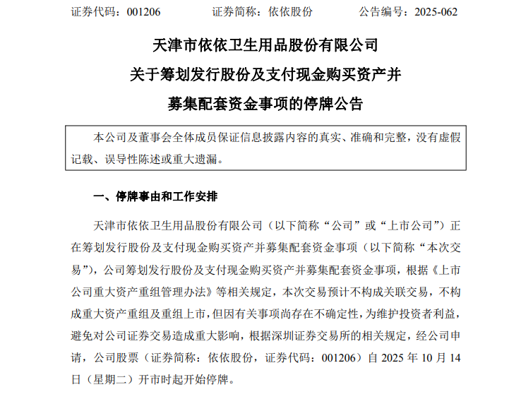 本次交易预计不构成关联交易,不构成重大资产重组及重组上市。公司股票自10月14日开市时起开始停牌。公司预计在不超过10个交易日的时间内披露本次交易方案。