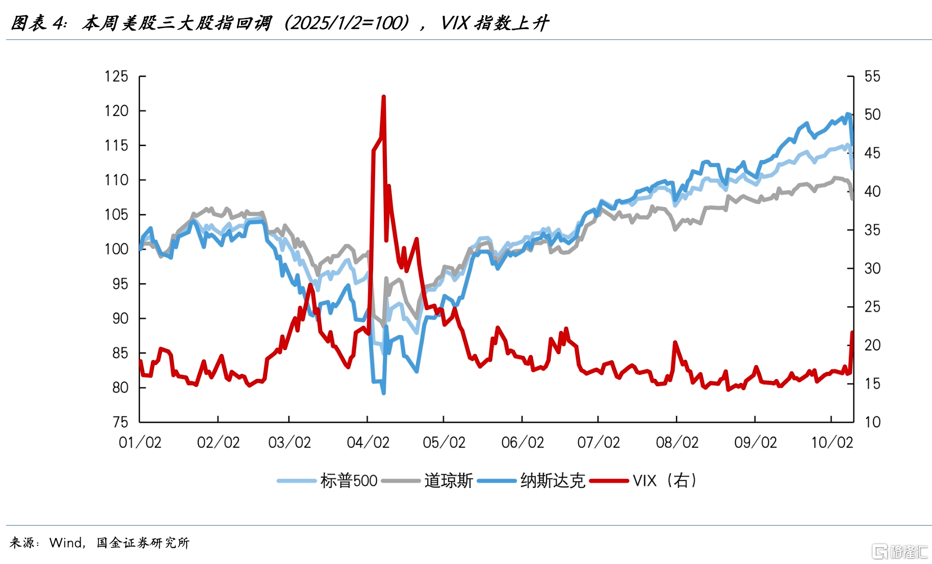 上周五美股主要股指均回调,标普500跌2.7%,波动率VIX指数最高升至22.44,但显著低于4月初对等关税落地后的高点。