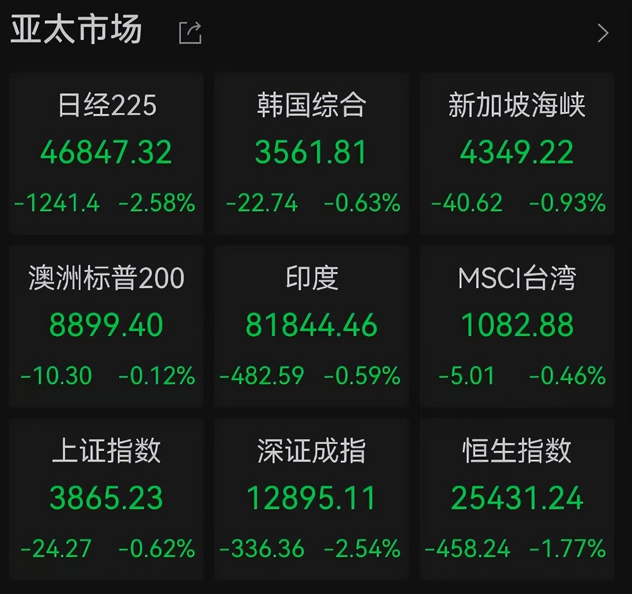 今日,亚太市场全线下跌。Wind数据显示,日经225指数收跌2.58%,创4月份以来最大单日跌幅,报46847.32点;韩国综合指数收跌0.63%,报3561.81点。恒生指数收跌1.77%,恒生科技指数收跌3.73%。