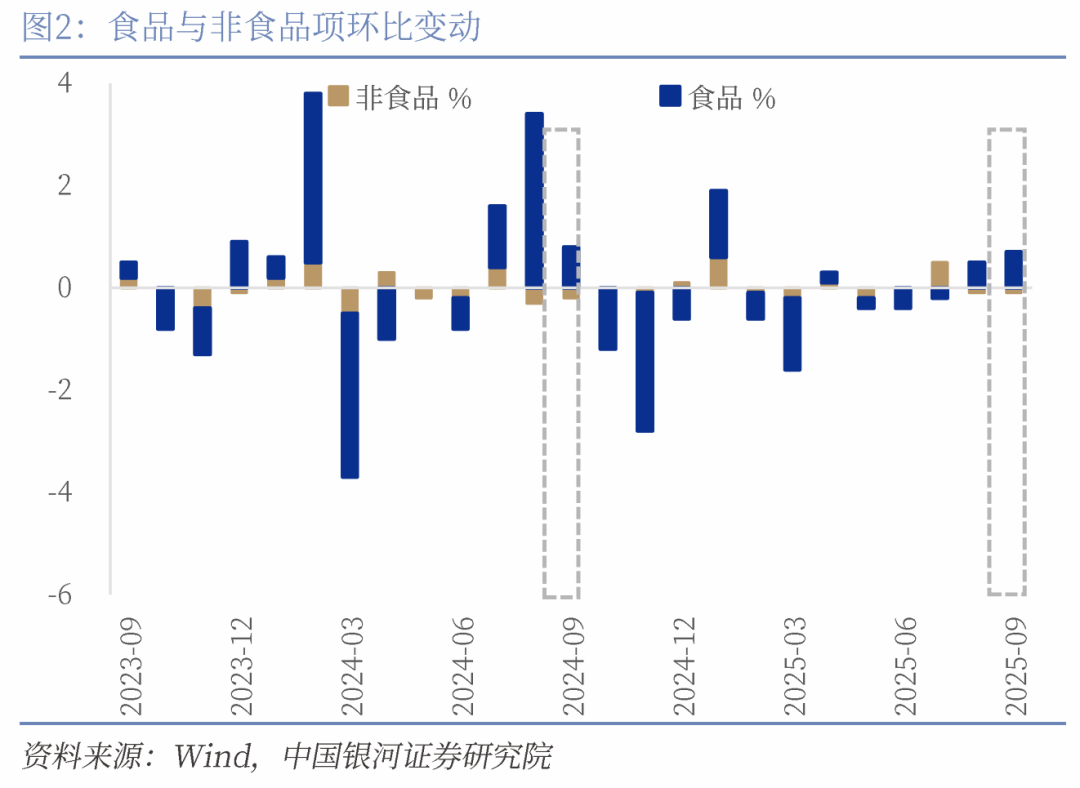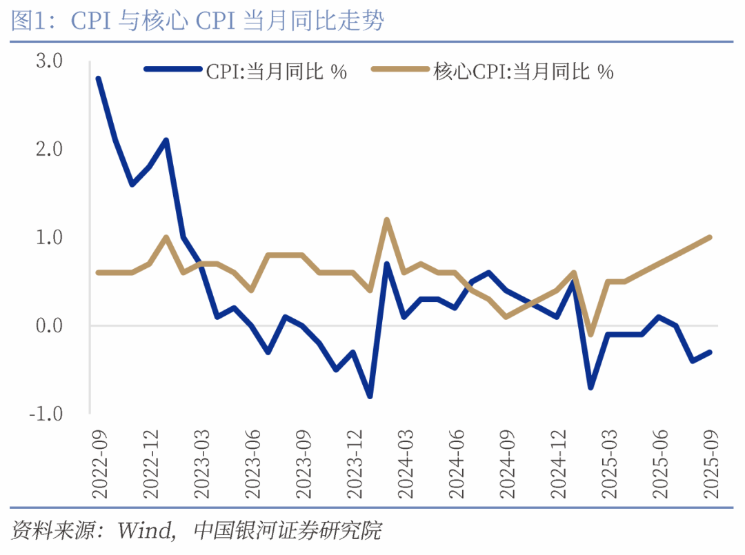 9月份CPI环比增长0.1%(前值持平),同比由下降0.4%收窄至下降0.3%,过去五年的同期环比均值为0.1%。其中食品价格环比上涨0.7%(前值0.5%),过去五年环比均值为0.5%;同比下降4.4%,影响CPI同比下降约0.83个百分点。非食品价格环比下降0.1%(前值-0.1%),过去五年环比均值为0.1%。核心CPI环比持平,同比上涨1.0%,涨幅连续第5个月扩大。