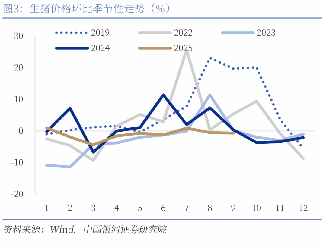 鸡蛋价格环比上涨2.7%(前值1.5%),高于近五年季节性2.2%的涨幅。国庆、中秋节前备货使得鸡蛋需求有所恢复,是9月鸡蛋价格上涨的主要原因。但鸡蛋的供给仍在增加,根据卓创资讯数据,9月全国在产蛋鸡存栏量约13.68亿只,环比增加0.2%,同比增加6.1%。因此若后续需求放缓,鸡蛋价格仍可能面临一定回调压力。