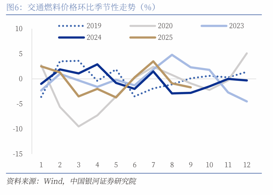 从跨区出行来看,9月国内航线日均执行航班量环比下降11.3%(前值+1.2%);从市内交通出行景气度来看,9月份12个主要城市地铁客运环比下降2.2%(前值-2.4%)。此外9月布伦特原油月均价格环比下降0.3%,受国际油价变动等影响,交通工具用燃料价格环比下降1.7%(前值-0.9%),过去五年同期环比均值为-0.6%。