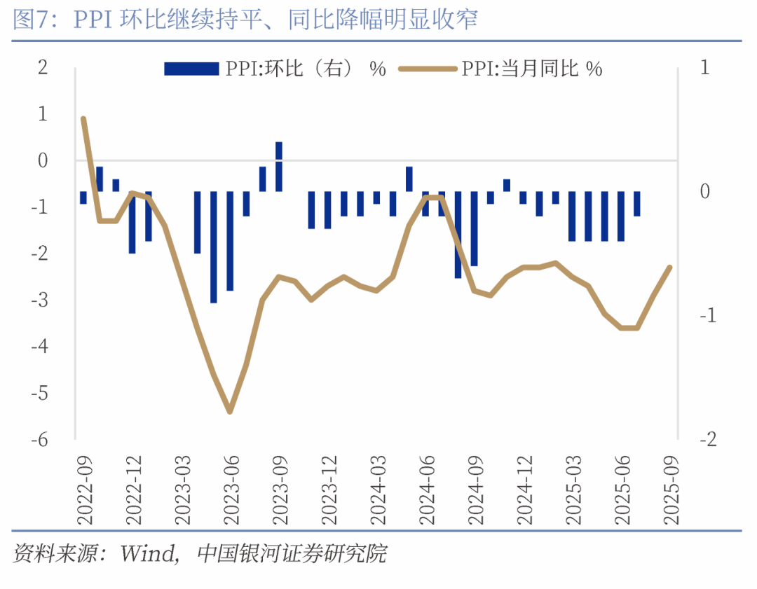 PPI同比降幅收窄、环比持平,政策效果延续:9月PPI环比持平(前值持平),同比增速-2.3%(前值-2.9%)。9月生产景气度继续上行,生产需求改善支撑部分能源和原材料行业价格环比转涨。全国统一大市场建设、部分行业产能治理成效显现以及去年同期基数较低带来的翘尾效应减弱共同推动PPI同比降幅收窄。