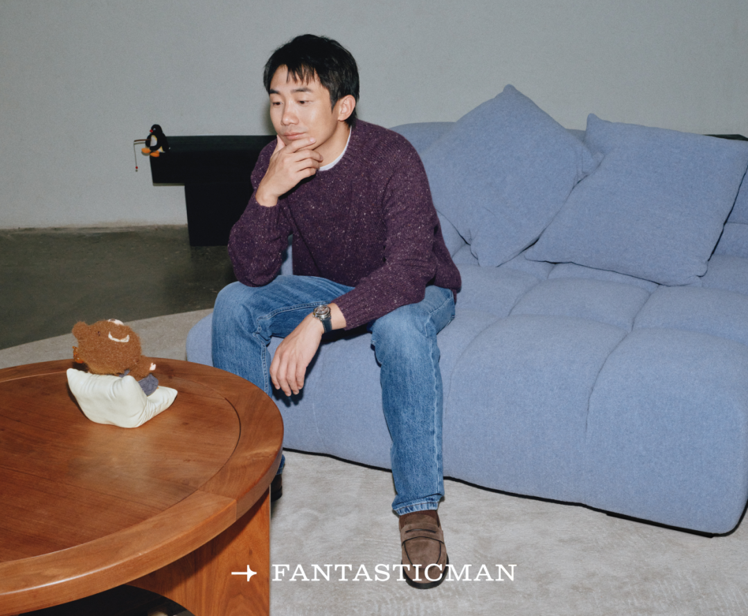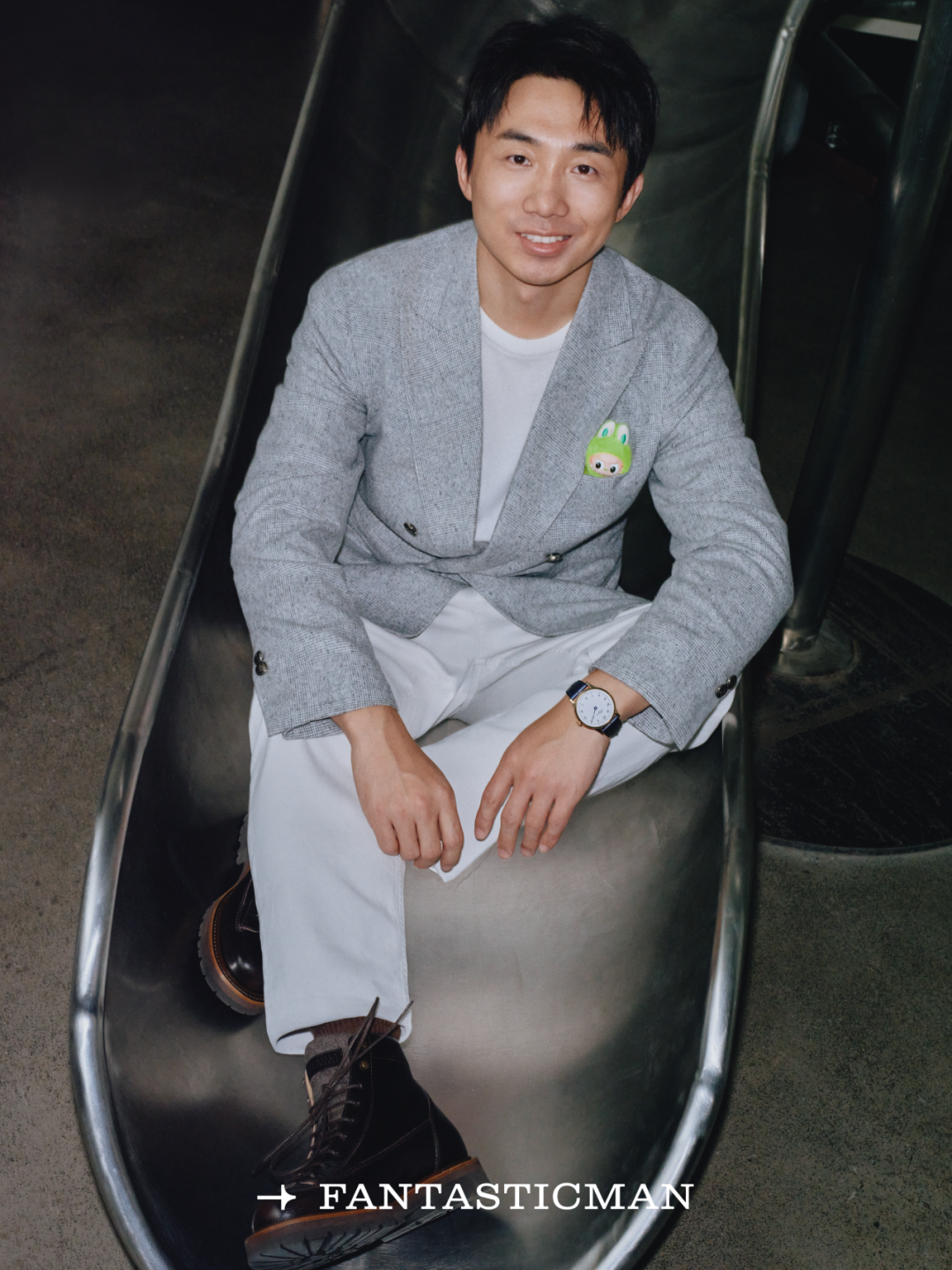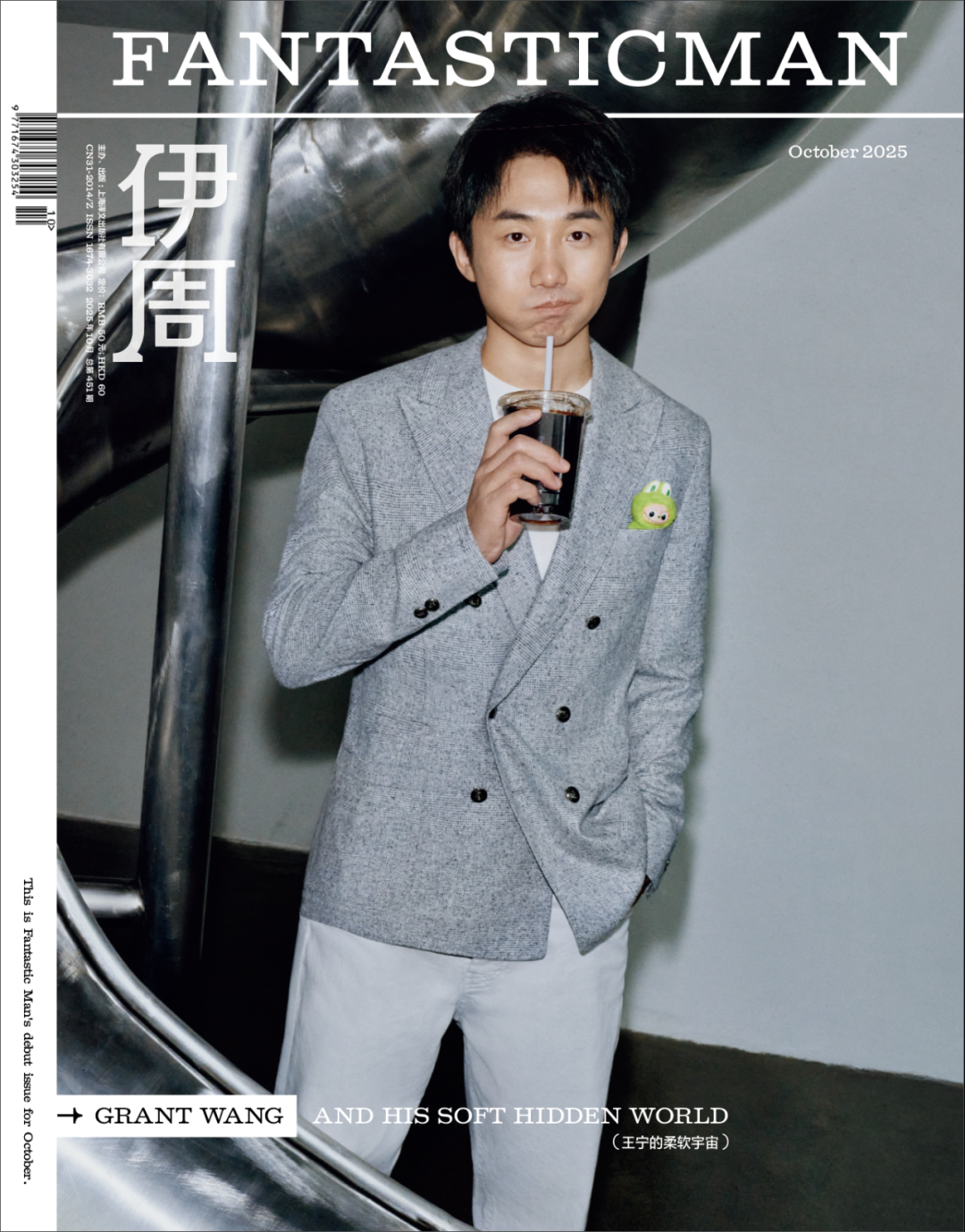 王宁登上《伊周Fantastic Man》The Debut Issue封面。他喝着咖啡注视着镜头,一只LABUBU从西装胸前口袋里探出了头。