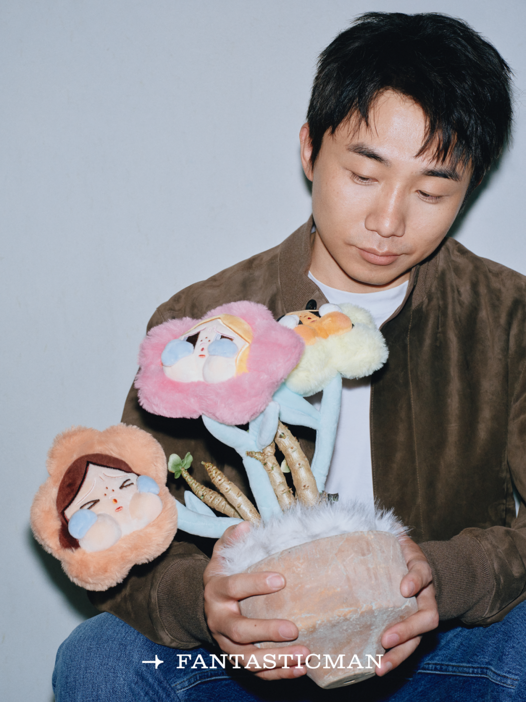 王宁安静地配合着拍摄,不怎么说话。LABUBU玩偶、星星人挂件、刚完工的CRYBABY毛绒盆栽,他都顺次接过,拿到手上。按照摄影师的要求,他做着轻松的表情,有一会儿还得躺在螺旋滑梯上。后来,他说起自己想躲起来。在以前这不是什么难事儿,但现在,恐怕不可能了。