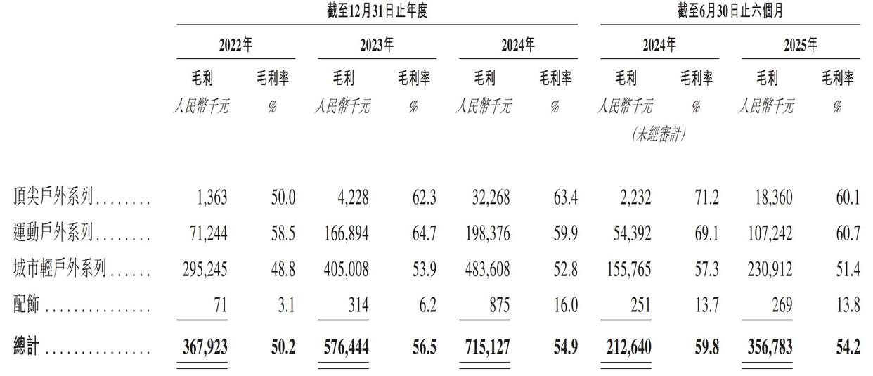 以2025年上半年数据来看,坦博尔运动户外系列的毛利率最高,为60.7%,报告期内产生的毛利为1.07亿元,其次是顶尖户外系列,毛利率为60.1%,相对而言,城市轻户外系列的毛利率略低,为51.4%。