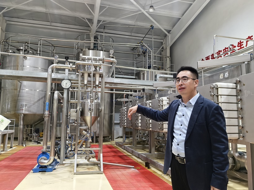 华欧淀粉总经理高瑞在车间介绍马铃薯加工流程 记者 吴杨 摄