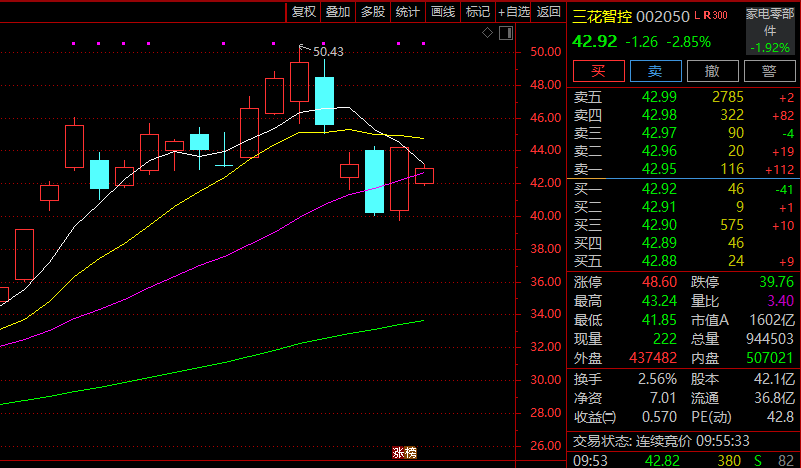 此外,值得注意的是,昨日涨停的三花智控(002050)今日低开。