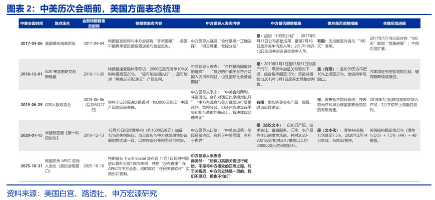 中美元首会晤前释放强硬立场是特朗普的惯用战术。历史上有四次案例,分别是2017年4月海湖庄园会晤、2018年G20会晤,2019年G20会晤,2020年一阶段协议。特朗普一般在会前1–2周释放强硬信号,迫使对手调整,但今年中方的应对策略与1.0并不相同。