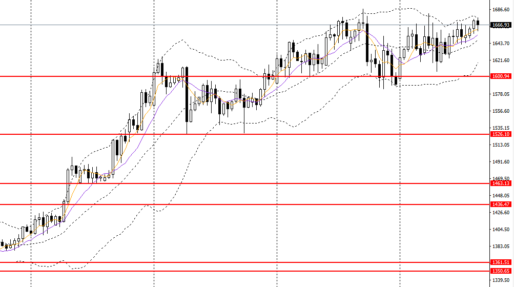 铂金重启升势,今日亚盘延续拉涨,立于5日均线上方,日线RSI到达高位,1650上方可维持低多思路,后市预计将上探1700。